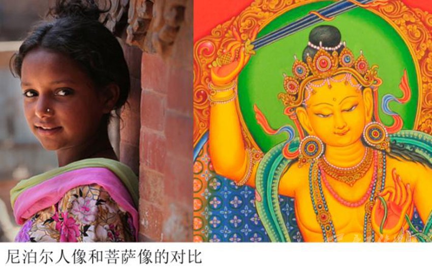 特別值得注意的是:之前佛教藝術(shù)的帕拉風(fēng)格繪畫中的臉型普遍是方正偏長的,而在尼瓦爾唐卡里,臉型普遍是方正偏短。偏短的方臉會(huì)讓五官顯得更加集中一點(diǎn),特別是眉額比較大、眼睛位置下移,這樣的感覺有點(diǎn)近似于嬰兒的面部比例。而眉骨、鼻骨高挺,又不似兒童,這樣的面部特征其實(shí)和尼國人的長相比較接近。也許是尼瓦爾人善于觀察、擅長描摹的天分,逐漸把本民族沉靜的性格與容貌,潛移默化地滲透進(jìn)了唐卡,產(chǎn)生了新的風(fēng)貌。