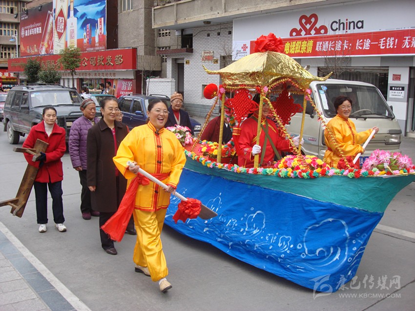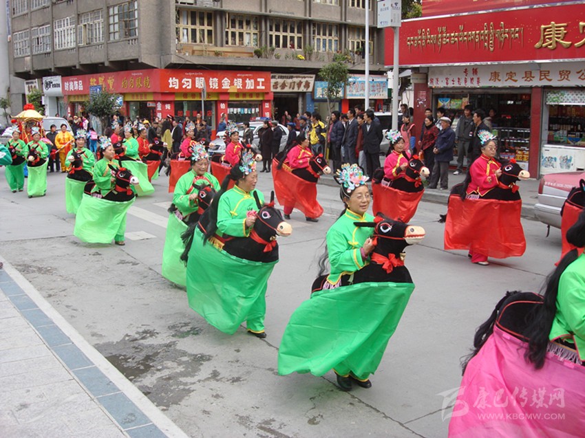 半個(gè)世紀(jì)風(fēng)靡康定城的“船燈”、“馬馬燈”、“鬧山鼓”、“扭秧歌”、“笑頭和尚戲柳翠”、“霸王鞭”……整個(gè)兒就像老陜過(guò)年時(shí)的“社戲”場(chǎng)面。大年初一、十五夜“出燈”游街,熱鬧氣氛把整個(gè)年節(jié)塞得滿滿的。記得我孩童時(shí)見(jiàn)過(guò)一次“出燈”游行,不是晚上而是在大白天(叫“出游”)。寺廟喇嘛吹奏佛樂(lè)走在前面,接著是“川北”人的川劇鑼鼓;再后面跟著的就是“馬馬燈”、劉老陜的“船燈”、鐵木社的“龍燈”、二輕局的“霸王鞭”、南門(mén)上的弦子隊(duì)、三居委的腰鼓隊(duì)、北三巷的“道孚鍋莊隊(duì)”……游行隊(duì)伍遇街口寬敞地方必圍圈演出?!叭死侠?,人老啦,人老先從頭上老,白的多來(lái)黑的少, 開(kāi)——船——羅!”“銀須飄灑”的艄公劉老陜用俏皮逗趣的陜腔告白開(kāi)場(chǎng)詞,在歡喜鑼鼓的伴奏中“劃”著旱船出了場(chǎng)。旱船闖“急流”、過(guò)“險(xiǎn)灘”,風(fēng)趣又逼真;如果哪家的姑娘打扮成古裝戲里的嬌美仕女坐上旱船游了街,那她立馬就成了康定城人皆贊譽(yù)的“美女”。接著就是“馬馬燈”,幾十個(gè)“騎馬橫槍”的古裝將士馳騁上場(chǎng),排兵布陣,穿梭并行,“馬”鈴聲鼓樂(lè)聲交織一起……鬧翻了康定城的“三山二水”。