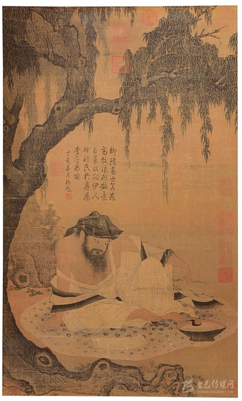 陶淵明曾說:“夏月虛閑,高臥北窗之下,清風颯至,自謂羲皇上人。”一個高人隱士酒后高臥草廬窗下,悠閑自得乘涼的形象躍然紙上。唐代詩人李白非常向往陶淵明恬淡閑逸、與世無爭、天人合一的隱逸生活,寫詩曰:“陶令日日醉,不知五柳春。素琴本無弦,漉酒用葛巾。清風北窗下,自謂羲皇人。何時到栗里,一見平生親?!北磉_了對陶淵明人品和理想的仰慕之情?,F(xiàn)藏于臺北故宮博物院的宋人《柳蔭高士圖》即是此意境。據(jù)《石渠寶笈》記載,此圖為素絹本著色畫,左方下有孫承澤印,右方下有北平孫氏印,左邊幅有棠村審定、蕉林二印。只知為宋人之作,相關的背景則無從查考。畫中為一棵古柳樹,樹干虬曲剛勁,枝葉繁茂。樹下一翁,美髯飄忽,袒胸露腹,頭戴葛巾,赤足席地而坐。坐前有一幅展開的手卷,酒樽滿盈,淺斟低酌。表面上看此翁雙目聚神,凝視手卷,實則已是眼餳耳熱,醺醺然不勝桮杓。清乾隆皇帝對《柳蔭高士圖》十分喜愛欣賞,在畫上御筆題詩云:“柳蔭高士若為高,放浪形骸意自豪。設問伊人何姓氏,于唐為李晉為陶?!鼻〉壅f,這位高士如是唐人就是李白,如是晉人便是陶淵明。但是從服飾和環(huán)境看,應是五柳先生陶潛也。這幅圖所表現(xiàn)的就是“心靜自然涼”。