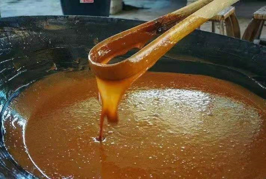 姐姐做好了午飯,我也完成了燒火任務(wù)。母親退掉了灶里燃燒的柴火,留下猩紅的火炭,將一瓢早已準(zhǔn)備好的麥芽漿倒入煮好的漿糊中,加水?dāng)嚢杈鶆蚝箪o置。直到吃完午飯,我們即將出發(fā)去大伯家時,我看到鍋里的漿糊上面析出一層透明的液體。此時母親又點(diǎn)燃了灶火繼續(xù)熬煮兩鍋漿糊,煮開后進(jìn)行過濾。再將濾出的糖水倒入洗凈的大鍋中熬煮。