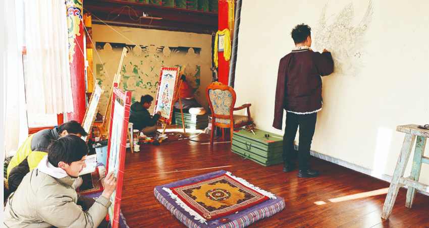 在繪畫工藝室里,筆者看到,其麥正在耐心指導一名學徒,“這里需要輕輕勾勒,不能太用力?!睂W生聽著其麥的教學,時而輕蘸顏料,時而勾勒線條,時而仔細端詳……其麥在家里以集中辦學的方式,為來自河坡鎮(zhèn)普馬村的貧困家庭子女共二十余人傳授門薩唐卡繪畫技巧,經(jīng)過耐心教學、傾心相授,現(xiàn)在這些學員大都掌握了門薩唐卡繪畫技藝。