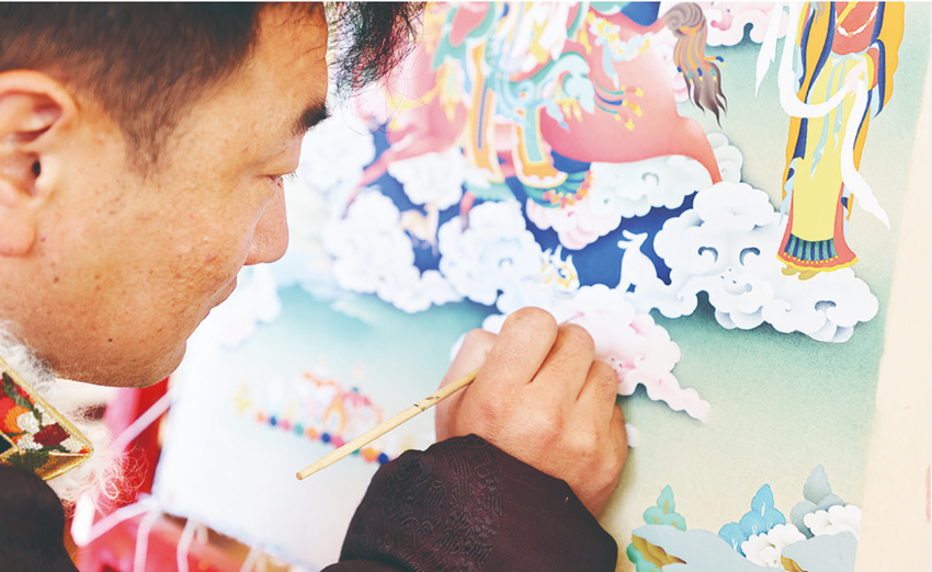 其麥從14歲開始便在父親的引導下學習門薩唐卡繪畫技藝,他勤奮刻苦、潛心鉆研,從25歲開始,便能獨當一面,并不斷取得突破,屢出精品,漸漸成為門薩唐卡繪畫和教學中的佼佼者,成為新時期小有名氣的唐卡畫師,并獲得“門薩唐卡省級非遺代表性傳承人”“四川省工藝美術大師”“四川省公益美術大師”“康巴文化傳承大師”“貢嘎工匠”等稱號,為白玉縣的手工藝術增添了濃墨重彩的一筆。