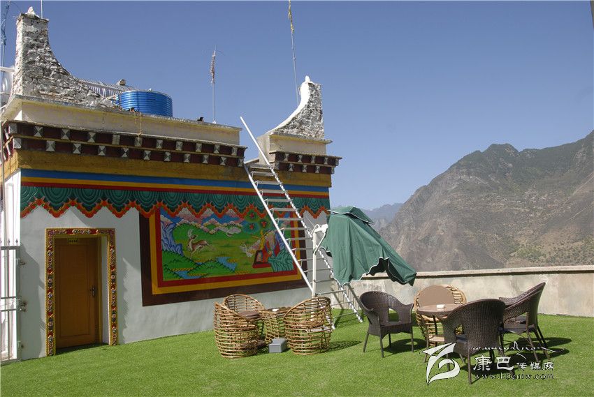 客棧的設(shè)計完全是藏式風格,很吻合楊荻給客棧起的名字:圣地映像。從大廳開始一直到客房,金碧輝煌、雕梁畫棟,每一處空間都被藏地色彩充滿。樓頂,視野開闊,左手青山,右手青天。幾個內(nèi)江來的客人已在客棧呆了好幾天,他們正在燦爛陽光下商量爬山的事,他們一再和楊荻碰面,希望晚上回到客棧能吃上本地的土雞。