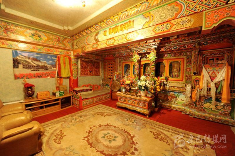 藏族居室一般分臥室、客廳、經(jīng)堂和廚房等部分。室內(nèi)陳設(shè)與裝飾如藏式建筑學(xué)者葉啟燊所言:“主次分明,重點(diǎn)突出。主室較為復(fù)雜而樸素,經(jīng)堂偏于華麗而清幽,其余各室均較簡(jiǎn)單。室內(nèi)都不施粉刷,但有個(gè)別的經(jīng)堂作雕刻裝飾;土司和喇嘛上層的經(jīng)堂則會(huì)作油漆的彩畫(huà)。”藏區(qū)不論是農(nóng)牧民住宅還是貴族上層府邸都有供佛的設(shè)施,經(jīng)堂屬于凈地,是專門(mén)供奉神佛的,因此,一般不作他用;主室是藏族住宅中最重要的一個(gè)房間,也是功能最多的房間,其中有生活、睡眠、飲食等所需的爐灶、壁櫥、壁架、矮桌、火盆等。這些藏式家具的布置安放,早已形成一定之規(guī)。