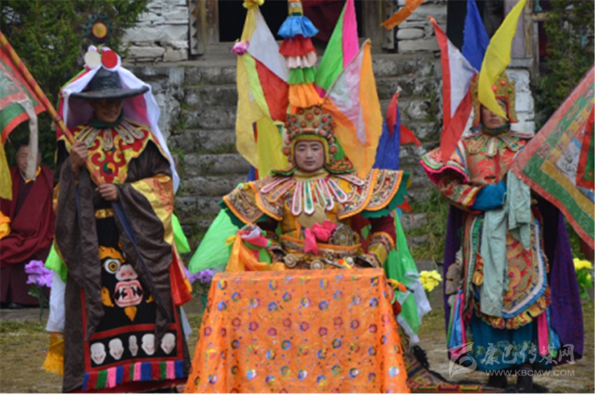 藏戲,是我鐘情的格薩爾史詩(shī)文化的重要組成部分。我在四川藏區(qū)、西藏、青海乃至甘肅、內(nèi)蒙古、新疆、云南等省區(qū),較多地欣賞到了各種流派的藏戲,從藏戲的表演特點(diǎn)上看,要把藏戲的表演特征完全歸類于哪一種流派,的確是不容易的事,也是不合理的。我們?nèi)绻咽澜缟系墓爬蠎騽澐譃槿蟛糠?,即古希臘喜劇和悲劇、印度梵劇和中國(guó)戲曲,那么我們很難把藏戲與這三種古老戲劇相區(qū)別,因?yàn)楸舜酥g有太多的相似之處,也有太多的差異。在我觀賞過(guò)的許多流派的藏戲看來(lái),感到其類型、表演方式和內(nèi)容較多地受到印度梵劇的影響,尤其藏戲開(kāi)場(chǎng)時(shí),在人物(如“溫巴”、“甲魯”、“拉姆”)的運(yùn)用上,顯然富有濃厚的印度梵劇中“概念人物劇”的特色和痕跡,但是,倘若因此認(rèn)為藏戲是從印度傳過(guò)來(lái)的,我以為這樣界定顯然有些牽強(qiáng)和武斷。因?yàn)椴貞虺艘杂《辱髣∮泻芏嘞嗨浦幫?,也在故事情?jié)的延伸有著很大的不同,尤其故事情節(jié)的細(xì)膩更是超越了印度梵劇,很多故事情節(jié)日益生活化,日益緊湊化,臺(tái)詞精細(xì)化,使其愈加超越并不同于印度梵劇。演員在服飾上也展示了大量的原始生活元素,并不具備較多的宗教服飾特征。