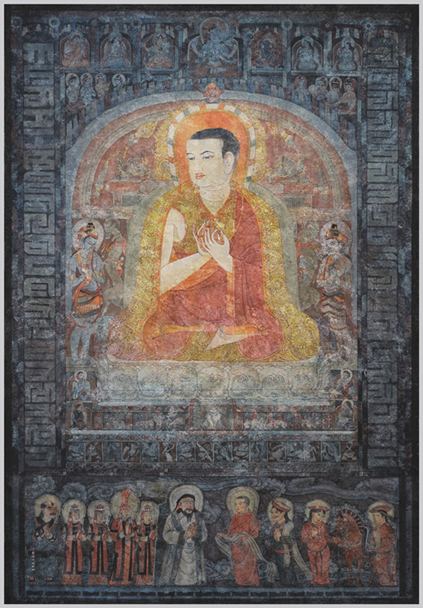 從“三怙主”往兩邊發(fā)展,分別是早期“薩迦五祖”中的前“四祖”:初祖貢噶寧布(1092--1158年);二祖索南孜摩(1142--1182年),三祖扎巴堅(jiān)贊(1147--1216年),四祖貢噶堅(jiān)贊(1180--1251年),即“薩迦班智達(dá)”。而薩迦第五祖就是畫面正中的八思巴(1235--1280年)。根據(jù)藏文史料,薩迦五祖中的前三祖稱為“白衣三祖”,因?yàn)樗麄兌紱]有正式出家受比丘戒,而是身著俗衣以居士身份自居;后二祖稱為“紅衣二祖”,因?yàn)樗麄z正式出家為僧,受過比丘戒,身著紅色袈裟。1253年夏天,忽必烈的軍隊(duì)到達(dá)六盤山一帶,請(qǐng)八思巴到軍營一敘,雖然有的史書記載之前八思巴就與忽必烈見過面,但這次是八思巴第一次以薩迦教主身份正式會(huì)見忽必烈。畫面的下方表現(xiàn)的就是“六盤山相會(huì)”的歷史場(chǎng)景。畫面右邊是八思巴一行列隊(duì)迎接的場(chǎng)面。中間著紅色吐蕃服裝者即是八思巴,他手捧哈達(dá)、神情莊嚴(yán)的給忽必烈獻(xiàn)上哈達(dá),紅色吐蕃衣服暗示他當(dāng)時(shí)還未受比丘戒的“紅衣”身份;在他身后哈達(dá)搭肩、雙手合十者為其弟恰那多吉,藏青色衣服暗示他的俗人身份;隊(duì)列后面是兩位服侍教主的僧侶,他們頭戴吐蕃氈帽、牽馬負(fù)笈等候在一旁。左邊是蒙古王族的儀仗隊(duì)列,為首便是身著白色裘衣的忽必烈。其后是三個(gè)侍女簇?fù)碇牟毂赝蹂?,第一位侍女扶著代表皇族的華蓋,而淡青色華蓋說明:忽必烈當(dāng)時(shí)尚未繼承蒙古大汗位。察必王妃和侍女皆穿著紅色的蒙古弘吉剌部落服裝,所不同的是王妃服飾比侍女服飾更顯尊貴和優(yōu)雅;隊(duì)伍的最后是一位穿著青衣、佩戴短刀的蒙古侍衛(wèi)。整個(gè)蒙古王族隊(duì)列面對(duì)將來的帝師八思巴,大家都謙遜、虔誠、靜穆地雙手合十致意。忽必烈、察必王妃以及八思巴的形象是根據(jù)古代繪畫作品和文字描述而創(chuàng)作的,服飾、用具、民風(fēng)民俗也都經(jīng)過仔細(xì)的研究考證。畫面兩邊是用“八思巴文”的字母組成的紀(jì)念柱,彰顯八思巴創(chuàng)立“蒙古新字”的功勛。受忽必烈指派,八思巴借鑒藏文拼讀方式創(chuàng)制出由41個(gè)字母構(gòu)成的一種新文字,其語音拼讀均按蒙語,又稱“八思巴蒙文”。八思巴向忽必烈呈獻(xiàn)蒙古新字后,忽必烈極為高興,并於1268年下詔,凡是詔書及各地方公文等均必須使用蒙古新字,在全國范圍內(nèi)推行這種新文字。