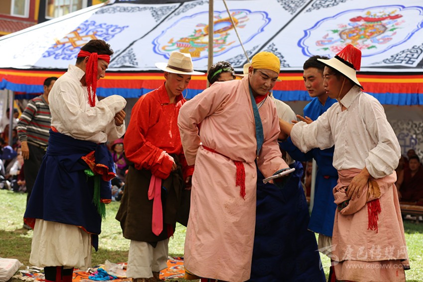 跳完《江嘎冉》和《扎西協(xié)哇》,藏戲團(tuán)的長者會告訴觀眾本次“央勒節(jié)”將要演的正劇名目。要在一周內(nèi)演完七大藏戲是不可能的,完整地演完一出戲需要十天半個月,因而通常都是取其中的折子戲演。如果是《文成公主》,專演祿東贊求親或是公主進(jìn)藏那段;若是《郎莎姑娘》,其受虐待被折磨的一處是必演的。有些婆婆對媳婦不好,人們就會嘲諷:“這些婆婆娘看朗莎姑娘受苦的戲時淚流滿面,回家面對媳婦時就忘了戲里的人了!”
