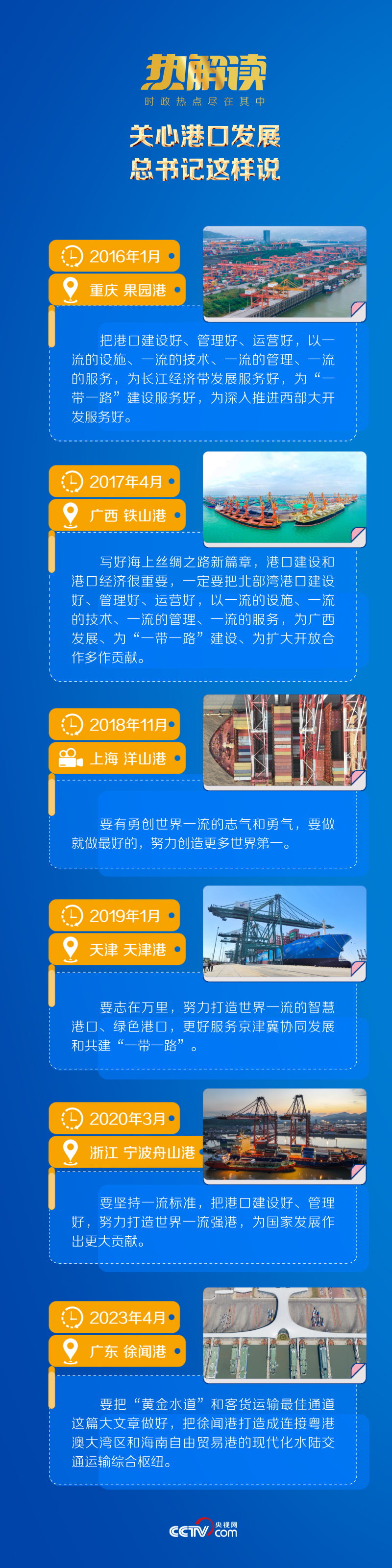 從內(nèi)河航運的黃金水道到國際航運的港通四海,總書記多次在考察行程中關(guān)注我國沿海沿江港口建設(shè),精心謀劃推進世界一流強港建設(shè)工作。