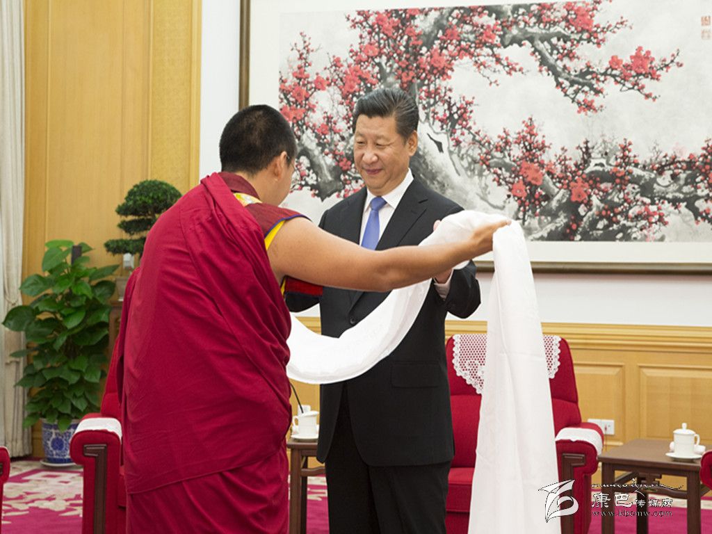 班禪向習近平敬獻了哈達,并介紹了他坐床20年來的情況,習近平對他在各方面取得的進步表示祝賀。
