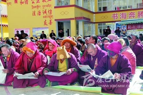 在白玉縣的宣講現(xiàn)場,《甘孜日報(bào)》藏文版成了“搶手貨”。