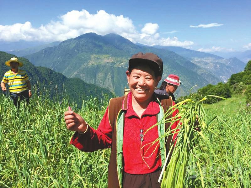 彭州市引入彭州蔬菜協(xié)會、彭州萱源農(nóng)業(yè)有限公司在黑水縣雙溜索鄉(xiāng)俄瓜村建設(shè)100畝大蒜標準化種植基地。圖為貧困群眾采收蒜薹。
