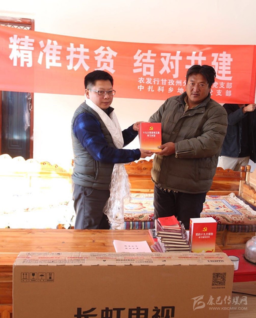 在中扎科鄉(xiāng)地龍村村級活動室,農(nóng)發(fā)行甘孜州分行工作組結(jié)合村情和幫扶實際,為當(dāng)?shù)鼗鶎痈刹亢忘h員代表宣講黨的十九大精神,共同探討產(chǎn)業(yè)扶貧新路子,并向地龍村黨員活動室捐贈了 液晶電視、黨建讀物和十九大學(xué)習(xí)專用筆記等物品。希望結(jié)對村支部能切實發(fā)揮基層黨組織在農(nóng)牧民群眾中的引領(lǐng)作用,基層黨員能加強責(zé)任意識和使命擔(dān)當(dāng),積極深入農(nóng)牧民群眾中發(fā)揮自身優(yōu)勢和黨員先鋒模范作用,以實際行動為群眾做出榜樣,團(tuán)結(jié)帶領(lǐng)全村群眾脫貧致富。