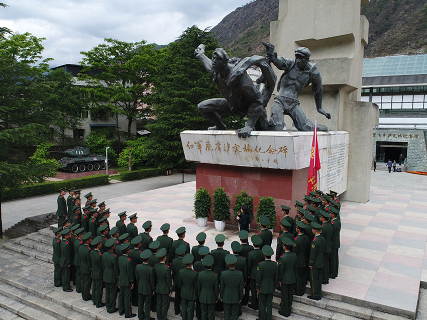 圖為官兵參觀紅軍飛奪瀘定橋紀念碑。