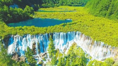 重建實(shí)踐彰顯生態(tài)理念——九寨溝景區(qū)內(nèi),尊重自然、綠色修復(fù)的舉措不勝枚舉。地震后,諾日朗瀑布出現(xiàn)一條16.8米長的裂縫,僅剩一股急流。景區(qū)就地取材,用地震中垮塌的鈣化物來填補(bǔ)“漏水”的裂縫,豐水期時(shí),諾日朗瀑布恢復(fù)了昔日壯觀景象。