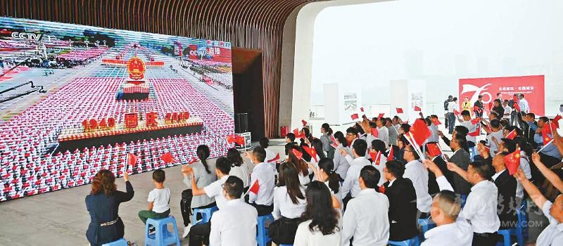 上午10時(shí),慶祝中華人民共和國(guó)成立70周年大會(huì)開始。通過(guò)電視信號(hào),大會(huì)盛況傳遞至每個(gè)現(xiàn)場(chǎng)。“與祖國(guó)母親同在,祝福祖國(guó)繁榮昌盛?!边@是大家共同的心聲。□本報(bào)記者 林凌 何勤華 程文雯 徐中成 陳碧紅 文莎