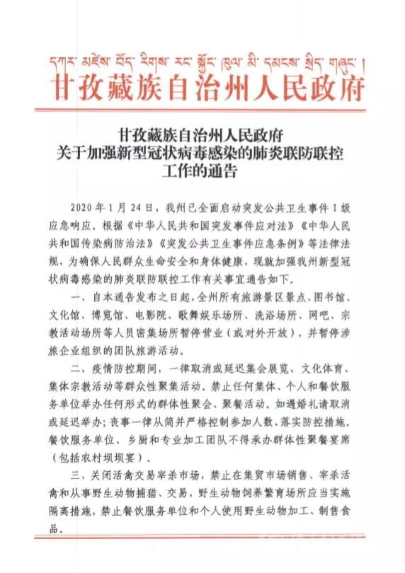 2020年1月24日,我州已全面啟動(dòng)突發(fā)公共衛(wèi)生事件I級(jí)應(yīng)急響應(yīng)。根據(jù)《中華人民共和國突發(fā)事件應(yīng)對(duì)法》《中華人民共和國傳染病防治法》《突發(fā)公共衛(wèi)生事件應(yīng)急條例》等法律法規(guī),為確保人民群眾生命安全和身體健康,現(xiàn)就加強(qiáng)我州新型冠狀病毒感染的肺炎聯(lián)防聯(lián)控工作有關(guān)事宜通告如下。一、自本通告發(fā)布之日起,全州所有旅游景區(qū)景點(diǎn)、圖書館、文化館、博覽館、電影院、歌舞娛樂場(chǎng)所、洗浴場(chǎng)所、網(wǎng)吧、宗教活動(dòng)場(chǎng)所等人員密集場(chǎng)所暫停營業(yè)(或?qū)ν忾_放),并暫停涉旅企業(yè)組織的團(tuán)隊(duì)旅游活動(dòng)。二、疫情防控期間,一律取消或延遲集會(huì)展覽、文化體育、集體宗教活動(dòng)等群眾性聚集活動(dòng)。禁止任何集體、個(gè)人和餐飲服務(wù)單位舉辦任何形式的群體性聚會(huì)、聚餐活動(dòng)。如遇婚禮請(qǐng)取消或延遲舉辦;喪事一律從簡(jiǎn)并嚴(yán)格控制參加人數(shù)、落實(shí)防控措施。餐飲服務(wù)單位、鄉(xiāng)廚和專業(yè)加工團(tuán)隊(duì)不得承辦群體性聚餐宴席(包括農(nóng)村壩壩宴)。三、關(guān)閉活禽交易宰殺市場(chǎng),禁止在集貿(mào)市場(chǎng)銷售、宰殺活禽和從事野生動(dòng)物捕獵、交易,野生動(dòng)物飼養(yǎng)繁育場(chǎng)所應(yīng)當(dāng)實(shí)施隔離措施,禁止餐飲服務(wù)單位和個(gè)人使用野生動(dòng)物加工、制售食品。四、嚴(yán)格執(zhí)行政府依法制定的價(jià)格干預(yù)措施和緊急措施,對(duì)假冒偽劣、惡意搶購、囤積居奇、哄抬物價(jià)等不法行為依法從嚴(yán)查處。五、廣大社會(huì)公眾要提高警惕,支持并參與愛國衛(wèi)生運(yùn)動(dòng),做好個(gè)人防護(hù),搞好居家消毒,減少外出和走親訪友,主動(dòng)報(bào)告涉及疫情傳播隱患的一切線索。1月10日以后,有過湖北等疫區(qū)旅居史的,請(qǐng)即刻報(bào)告所在地村委會(huì)(社區(qū))登記備案,自返鄉(xiāng)(進(jìn)州)之日起居家隔離觀察14天,并進(jìn)行早晚體溫監(jiān)測(cè)記錄和核驗(yàn);一旦出現(xiàn)發(fā)熱、乏力、呼吸困難、呼吸道感染(干咳為主)等癥狀,請(qǐng)立即佩戴口罩就近到當(dāng)?shù)蒯t(yī)療機(jī)構(gòu)發(fā)熱門診就診。六、州域內(nèi)所有單位和個(gè)人,必須接受衛(wèi)生行政主管部門或有關(guān)機(jī)構(gòu)的傳染病調(diào)查檢測(cè)、采集樣本等預(yù)防措施;病人、疑似病人和傳染病病人密切接觸者應(yīng)當(dāng)積極配合接受隔離治療、醫(yī)學(xué)觀察等控制措施,并如實(shí)提供有關(guān)情況。對(duì)拒絕配合的,公安機(jī)關(guān)將依法協(xié)助強(qiáng)制執(zhí)行;對(duì)妨害執(zhí)行公務(wù)的,公安機(jī)關(guān)將依法從嚴(yán)從重處理。七、嚴(yán)禁任何單位和個(gè)人發(fā)布不實(shí)信息,對(duì)有造謠、傳謠等違法行為的,公安機(jī)關(guān)將依法嚴(yán)厲查處。本通告自發(fā)布之日起施行,終止日期另行通告。