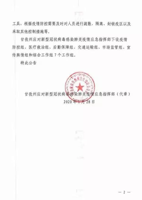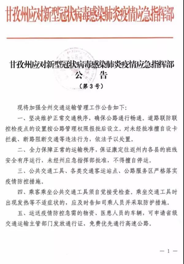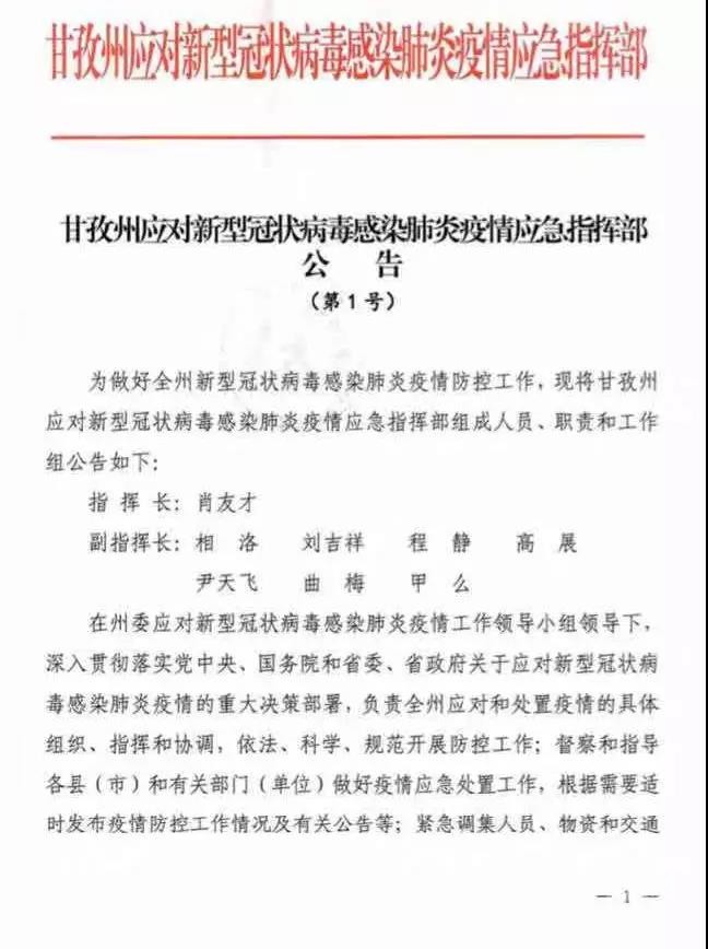 近日,甘孜州應(yīng)對新型冠狀病毒感染肺炎疫情應(yīng)急指揮部發(fā)布第1號(hào)、第2號(hào)、第3號(hào)公告。