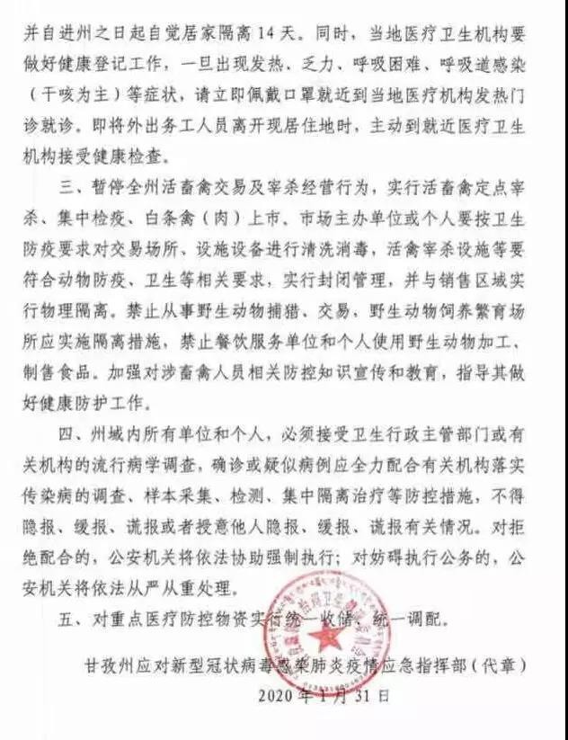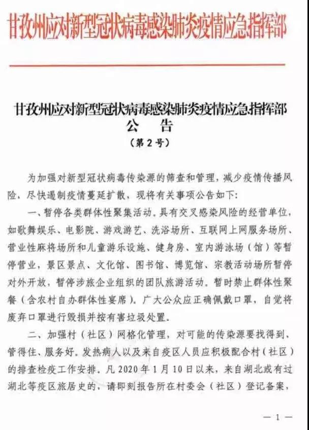 一、暫停各類群體性聚集活動(dòng)。具有交叉感染風(fēng)險(xiǎn)的經(jīng)營單位,如歌舞娛樂、電影院、游戲游藝、洗浴場所、互聯(lián)網(wǎng)上網(wǎng)服務(wù)場所、營業(yè)性麻將場所和兒童游樂設(shè)施、健身房、室內(nèi)游泳場(館)等暫停營業(yè),景區(qū)景點(diǎn)、文化館、圖書館、博覽館、宗教活動(dòng)場所暫停對外開放,暫停涉旅企業(yè)組織的團(tuán)隊(duì)旅游活動(dòng)。暫時(shí)禁止群體性聚餐(含農(nóng)村自辦群體性宴席)。廣大公眾應(yīng)正確佩戴口罩,自覺將廢棄口罩進(jìn)行毀損并按有害垃圾處置。二、加強(qiáng)村(社區(qū))網(wǎng)格化管理,對可能的傳染源要找得到、管得住、服務(wù)好。發(fā)熱病人以及來自疫區(qū)人員應(yīng)積極配合村(社區(qū))的排查檢疫工作安排。凡2020年1月10日以來,來自湖北或有過湖北等疫區(qū)旅居史的,請即刻報(bào)告所在村委會(huì)(社區(qū))登記備案,并自進(jìn)州之日起自覺居家隔離14天。同時(shí),當(dāng)?shù)蒯t(yī)療衛(wèi)生機(jī)構(gòu)要做好健康登記工作,一旦出現(xiàn)發(fā)熱、乏力、呼吸困難、呼吸道感染(干咳為主)等癥狀,請立即佩戴口罩就近到當(dāng)?shù)蒯t(yī)療機(jī)構(gòu)發(fā)熱門診就診。即將外出務(wù)工人員離開現(xiàn)居住地時(shí),主動(dòng)到就近醫(yī)療衛(wèi)生機(jī)構(gòu)接受健康檢查。三、暫停全州活畜禽交易及宰殺經(jīng)營行為,實(shí)行活畜禽定點(diǎn)宰殺、集中檢疫、白條禽(肉)上市。市場主辦單位或個(gè)人要按衛(wèi)生防疫要求對交易場所、設(shè)施設(shè)備進(jìn)行清洗消毒,活禽宰殺設(shè)施等要符合動(dòng)物防疫、衛(wèi)生等相關(guān)要求,實(shí)行封閉管理,并與銷售區(qū)域?qū)嵭形锢砀綦x。禁止從事野生動(dòng)物捕獵、交易,野生動(dòng)物飼養(yǎng)繁育場所應(yīng)實(shí)施隔離措施,禁止餐飲服務(wù)單位和個(gè)人使用野生動(dòng)物加工、制售食品。加強(qiáng)對涉畜禽人員相關(guān)防控知識(shí)宣傳和教育,指導(dǎo)其做好健康防護(hù)工作。四、州域內(nèi)所有單位和個(gè)人,必須接受衛(wèi)生行政主管部門或有關(guān)機(jī)構(gòu)的流行病學(xué)調(diào)查,確診或疑似病例應(yīng)全力配合有關(guān)機(jī)構(gòu)落實(shí)傳染病的調(diào)查、樣本采集、檢測、集中隔離治療等防控措施,不得隱報(bào)、緩報(bào)、謊報(bào)或者授意他人隱報(bào)、緩報(bào)、謊報(bào)有關(guān)情況。對拒絕配合的,公安機(jī)關(guān)將依法協(xié)助強(qiáng)制執(zhí)行;對妨礙執(zhí)行公務(wù)的,公安機(jī)關(guān)將依法從嚴(yán)從重處理。五、對重點(diǎn)醫(yī)療防控物資實(shí)行統(tǒng)一收儲(chǔ)、統(tǒng)一調(diào)配。甘孜州應(yīng)對新型冠狀病毒感染肺炎疫情應(yīng)急指揮部