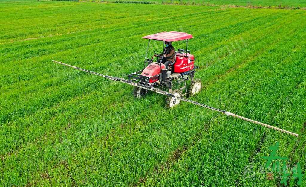 成都市青白江區(qū)彌牟鎮(zhèn)的智農(nóng)農(nóng)機(jī)專(zhuān)業(yè)合作社,工人正操作自走式噴桿噴霧機(jī)在麥田里打藥。