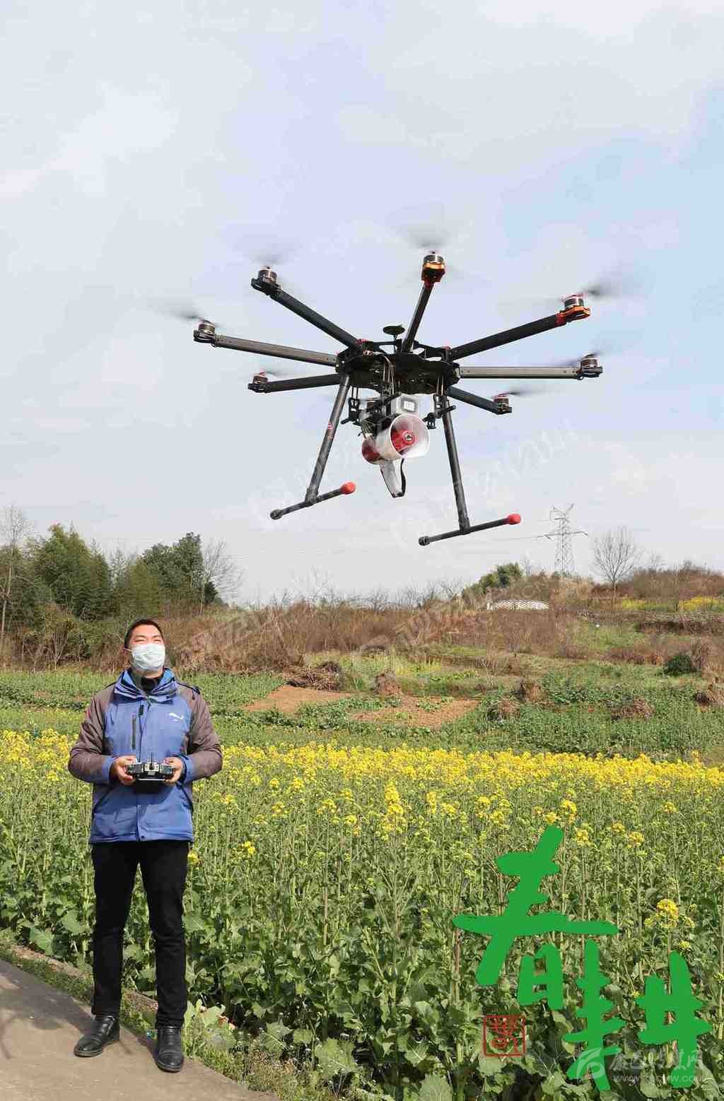 彭州市桂花鎮(zhèn)高峰村,技術(shù)員操作無(wú)人機(jī)穿梭在田間。