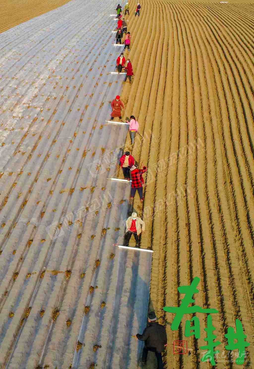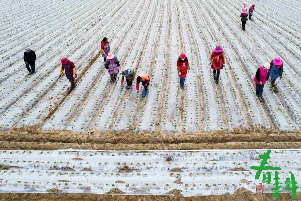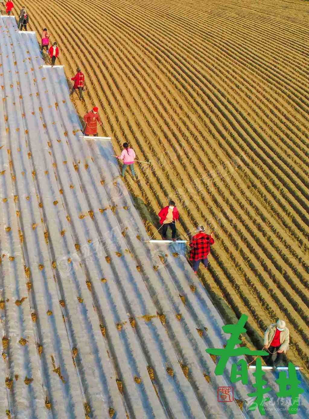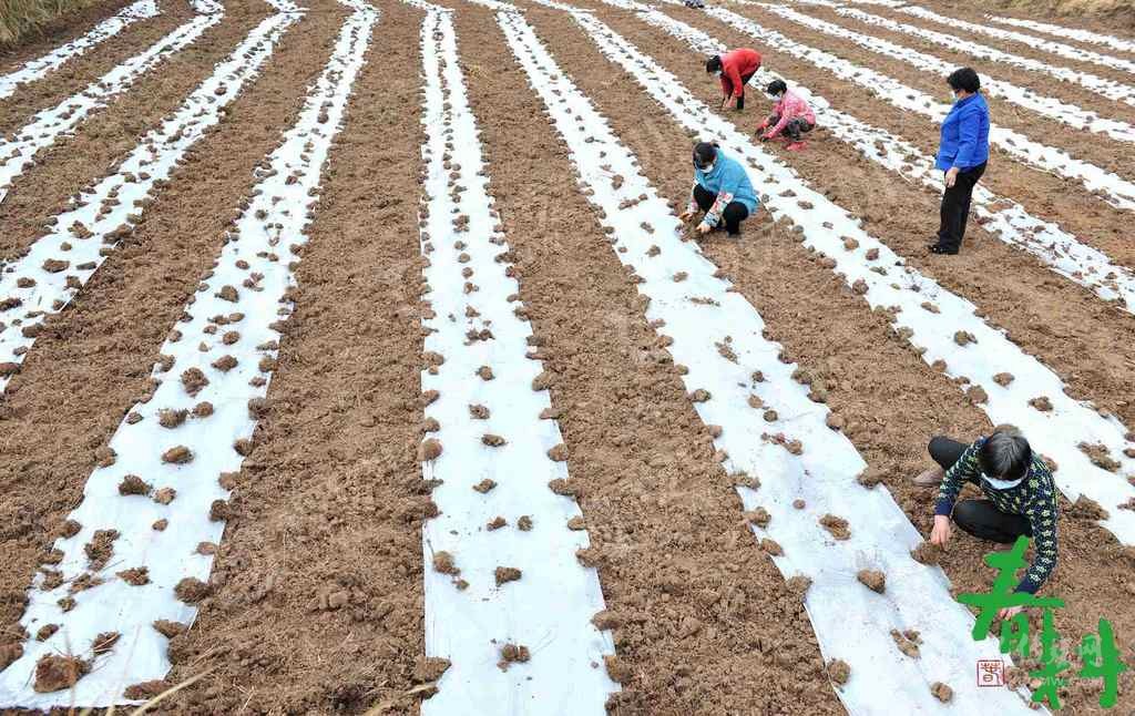 射洪市沱牌鎮(zhèn)桑樹(shù)林村,戴著口罩的農(nóng)戶正在地里播種、蓋膜。