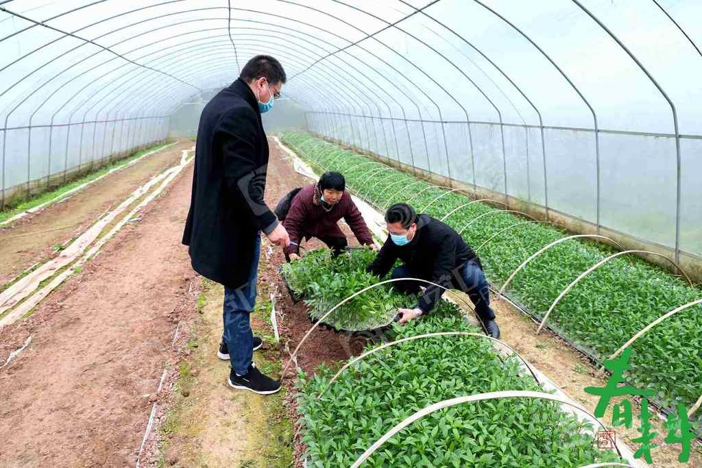 廣安市廣安區(qū)信訪局幫扶黨員干部正在悅來(lái)鎮(zhèn)大棚蔬菜育苗基地起海椒苗。