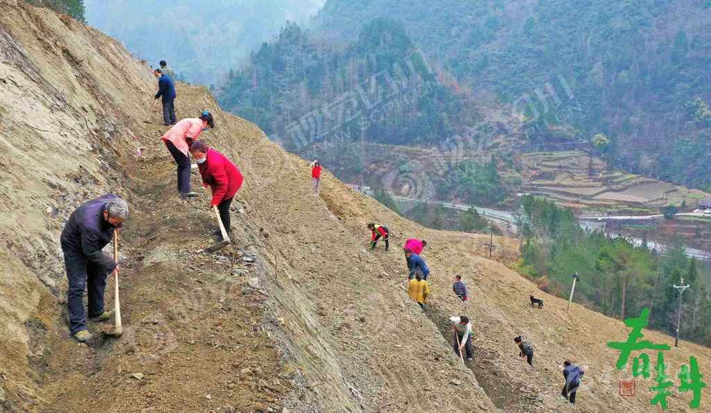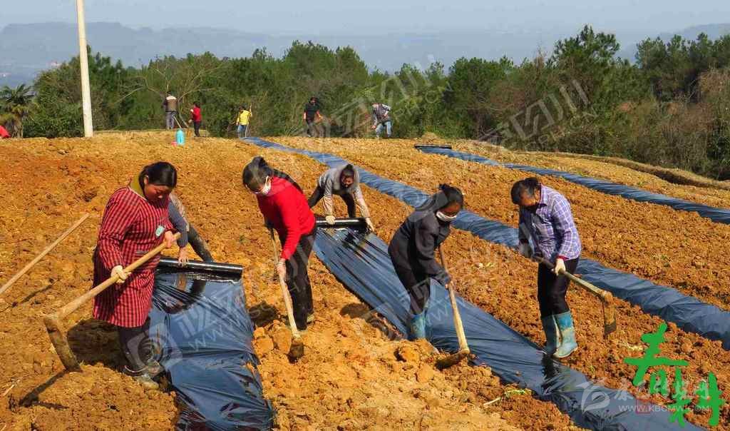 巴中市南江縣紅光鎮(zhèn)石寨村村民帶著口罩在開(kāi)墾的荒坡地上開(kāi)溝壘廂、覆蓋地膜,準(zhǔn)備栽植茶苗。