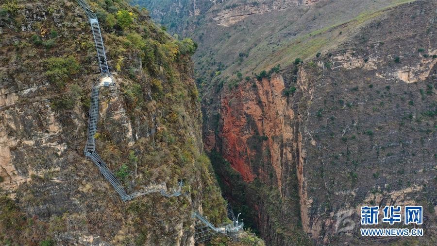 這是2019年11月22日拍攝的四川省昭覺縣支爾莫鄉(xiāng)阿土列爾村的懸崖鋼梯(無人機(jī)照片)。新華社記者 王曦 攝