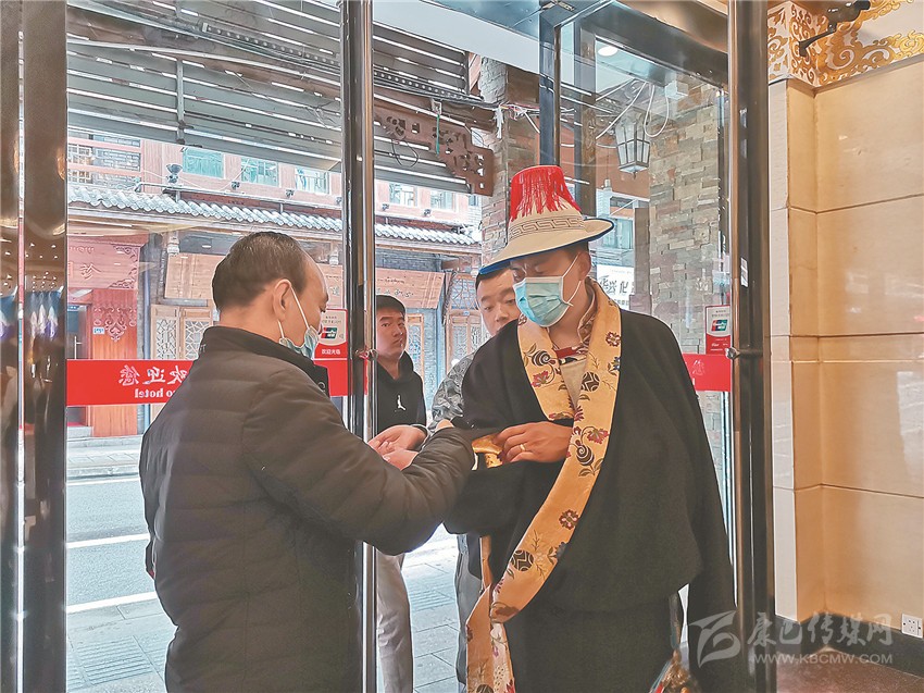 色達縣演出隊入住邦金麥朵酒店。每天,酒店安保人員多扎準時出現在門口,提醒演職人員測量體溫、佩戴口罩?!拔沂蔷频甑牡谝魂P卡,拉姆是第二關,我倆相互配合,表演節(jié)目的客人住得放心,演出的節(jié)目才會更加精彩?!蹦弥w溫槍,多扎一臉自豪地說。