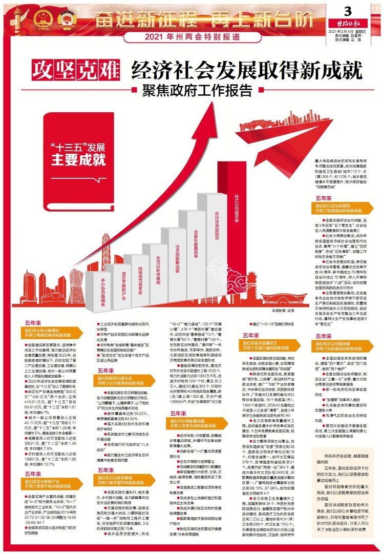 “十三五”期間,我州全面實施產(chǎn)業(yè)富民戰(zhàn)略,構(gòu)建形成“4+6”現(xiàn)代服務業(yè)體系、“6+1”綠色現(xiàn)代工業(yè)體系、“10+2”現(xiàn)代農(nóng)業(yè)產(chǎn)業(yè)體系?!笆濉逼陂g,我州全面實施生態(tài)文明建設戰(zhàn)略,全力創(chuàng)建國家生態(tài)文明建設示范區(qū),“山頂戴帽子、山腰掙票子、山下飽肚子”的立體生態(tài)格局基本形成?!笆濉逼陂g,我州全面實施扶貧攻堅戰(zhàn)略,實現(xiàn)精準脫貧攻堅和保障改善民生“雙加強”,脫貧任務全面完成、社會事業(yè)全面發(fā)展、民生保障全面提升?!笆濉逼陂g,我州全面實施依法治州戰(zhàn)略,連續(xù)3年實現(xiàn)“五個零發(fā)生”,社會治安人民滿意度躍升至全省第三……