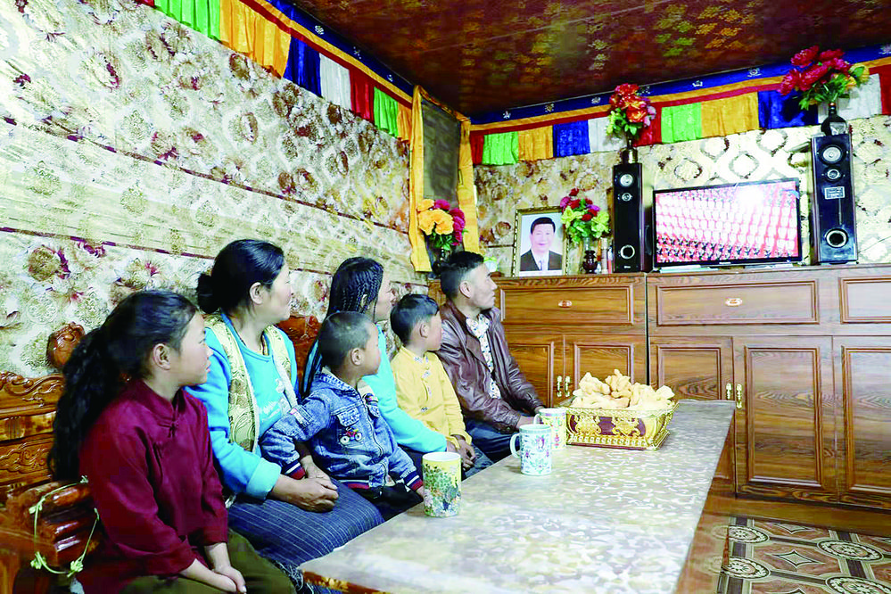 石渠縣蒙宜鎮(zhèn)牧民澤仁巴措一家觀看慶祝大會(huì)直播。