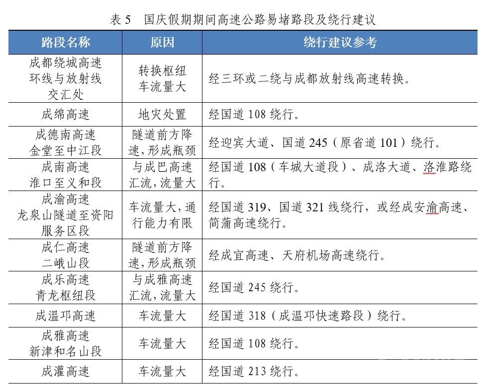 預(yù)計車流量主要圍繞成都等中心城市呈放射狀分布。節(jié)日期間,成都市周邊各主線站以及連通主線站的環(huán)線高速車流量最為密集,假期出行主要方向集中在成都往德陽、眉山往內(nèi)江、內(nèi)江往自貢、成都往雅安、成都往都江堰以及成都往重慶方向。