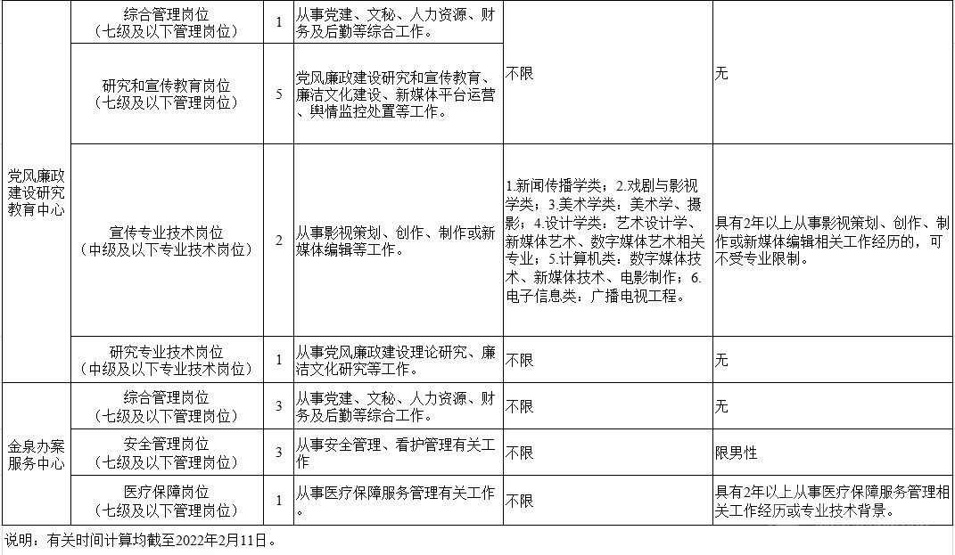 考調(diào)名額 考調(diào)事業(yè)人員25名。其中,信息技術(shù)中心管理崗位9名,黨風(fēng)廉政建設(shè)研究教育中心管理崗位6名、專業(yè)技術(shù)崗位3名,金泉辦案服務(wù)中心管理崗位7名。 考調(diào)對(duì)象及條件 考調(diào)對(duì)象 全省范圍內(nèi)行政單位或參公事業(yè)單位一級(jí)主任科員(含)以下職級(jí)及相當(dāng)職務(wù)層次人員;縣級(jí)及以上公益一類或全額撥款事業(yè)單位管理崗位七級(jí)及以下職員、專業(yè)技術(shù)崗位中級(jí)及以下工作人員。 考調(diào)條件 具有良好的政治素質(zhì)、專業(yè)素養(yǎng),品行端正,實(shí)績(jī)突出,群眾公認(rèn)。 中共黨員。 全日制大學(xué)本科及以上學(xué)歷,并取得相應(yīng)學(xué)士及以上學(xué)位。 年齡35周歲以下(1986年2月11日及以后出生)。 歷年年度考核均為合格(稱職)及以上。 身體心理健康,具有正常履行職責(zé)的身體條件和心理素質(zhì)。 符合報(bào)考崗位規(guī)定的資格條件,詳見(jiàn)《中共四川省紀(jì)委四川省監(jiān)委2022年公開(kāi)考調(diào)事業(yè)人員崗位情況表》(附后)。 符合法律、法規(guī)規(guī)定的其他條件。 有關(guān)時(shí)間計(jì)算均截至2022年2月11日。 具有下列情形之一的,不得報(bào)考: 被依法列為失信聯(lián)合懲戒對(duì)象的。 涉嫌違紀(jì)違法正在接受有關(guān)專門(mén)機(jī)關(guān)審查尚未作出結(jié)論的。 受過(guò)黨紀(jì)政務(wù)處分或司法機(jī)關(guān)刑事處罰的。 受到誡勉、組織處理等影響期未滿或期滿影響使用的。 按照有關(guān)規(guī)定,到定向單位工作未滿服務(wù)年限或有其他限制性規(guī)定的。 尚在試用期的。 按照相關(guān)規(guī)定應(yīng)當(dāng)回避的。 法律、法規(guī)規(guī)定的其他情形。 報(bào)名及打印準(zhǔn)考證 2022年2月22日上午8:00至2月26日下午18:00,報(bào)名人員登錄四川省人力資源和社會(huì)保障廳官網(wǎng)(http://rst.sc.gov.cn/)首頁(yè)“人事考試”專欄進(jìn)行網(wǎng)上報(bào)名,每人限報(bào)一個(gè)崗位。 對(duì)報(bào)名人員進(jìn)行網(wǎng)上資格初審,通過(guò)資格初審者可于2022年3月1日上午8:00至3月2日下午18:00,登陸報(bào)名系統(tǒng)打印筆試準(zhǔn)考證。 考試 考試分筆試和面試。其中,信息技術(shù)崗位A、信息技術(shù)崗位B、宣傳專業(yè)技術(shù)崗位需加試專業(yè)測(cè)試。 根據(jù)筆試情況,擇優(yōu)確定進(jìn)入面試的人選,并適時(shí)開(kāi)展資格復(fù)審和心理素質(zhì)測(cè)試。資格復(fù)審、心理素質(zhì)測(cè)試、面試時(shí)間和地點(diǎn)另行電話通知。 考察、體檢及試用 考察 根據(jù)考試情況,擇優(yōu)差額確定進(jìn)入考察對(duì)象,深入考察了解人選政治表現(xiàn)、工作能力、廉潔自律和性格特點(diǎn)等。 體檢 根據(jù)考察情況和職位要求,擇優(yōu)等額確定進(jìn)入體檢人選,參照《公務(wù)員錄用體檢通用標(biāo)準(zhǔn)(試行)》進(jìn)行體檢。 頂崗試用 綜合人選考試成績(jī)、考察情況,根據(jù)工作需要和人崗相適原則,擇優(yōu)確定頂崗試用人選。 調(diào)入 試用期滿后,根據(jù)考調(diào)名額和試用期間表現(xiàn),研究確定擬調(diào)人員,經(jīng)公示后按規(guī)定程序辦理調(diào)入手續(xù)。 注意事項(xiàng) 報(bào)考者應(yīng)保證提供真實(shí)、準(zhǔn)確、全面的個(gè)人信息和資料,如有弄虛作假的行為,將按有關(guān)規(guī)定嚴(yán)肅處理。 資格審查貫穿考調(diào)全過(guò)程,任一環(huán)節(jié)發(fā)現(xiàn)有不符合考調(diào)條件的,取消考調(diào)資格。 報(bào)名時(shí)請(qǐng)按要求填寫(xiě)本人手機(jī)號(hào)碼,并保持通訊暢通。未入圍下一環(huán)節(jié)人員,不再另行通知。 進(jìn)入資格復(fù)審者,需由有干部管理權(quán)限的主管部門(mén)出具同意考調(diào)的書(shū)面意見(jiàn)并加蓋公章。 嚴(yán)明考調(diào)紀(jì)律,報(bào)名者不得托人說(shuō)情、打招呼,一經(jīng)發(fā)現(xiàn)即取消資格。 遵守疫情防控相關(guān)規(guī)定,服從工作人員安排。 同時(shí),四川省紀(jì)委監(jiān)委還提供相關(guān)咨詢電話:028—62555435;62555354。 (點(diǎn)擊查看大圖)