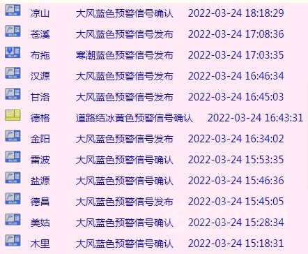 24小時內,四川多地大風藍色預警信號生效中↘