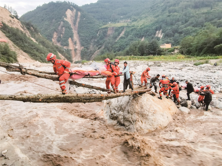 道路中斷、信號中斷,河流上漲、橋梁垮塌?!皼]有橋,我們的雙手就是橋?!标P(guān)鍵時(shí)刻,四川省森林消防總隊(duì)甘孜支隊(duì)消防員兵分兩路實(shí)施營救。一路“繩為引、步為尺”先期過河救治傷員,一路就地取材急流上用樹干搭起“生命通道”,自制擔(dān)架將傷員一一運(yùn)送過河;截至5日晚23時(shí)40分,甘孜森林消防隊(duì)員們翻山越嶺往返近7小時(shí),安全轉(zhuǎn)運(yùn)重傷員24人、近200名群眾,徒步行程18公里。