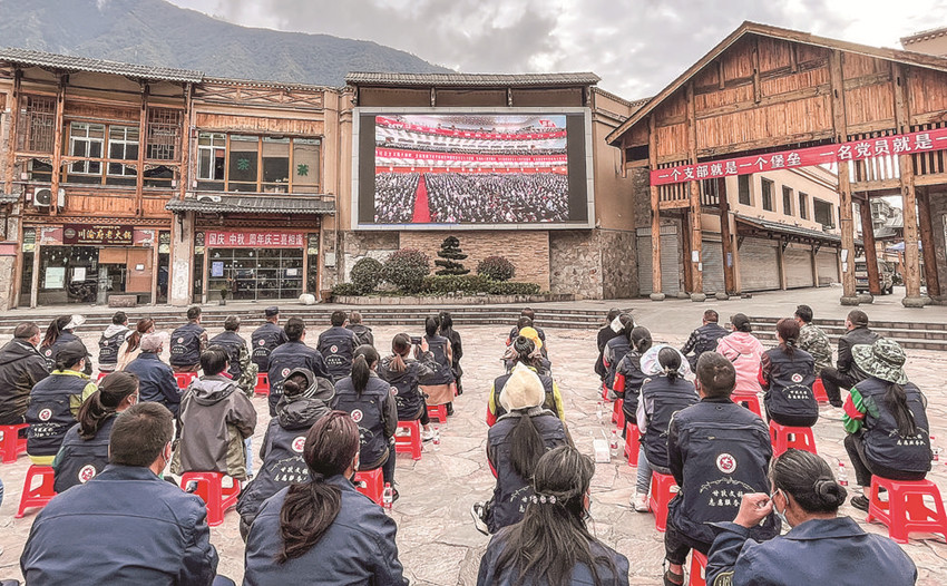 海螺溝干部群眾在貢嘎廣場(chǎng)收看黨的二十大開幕會(huì)。 海宣 攝