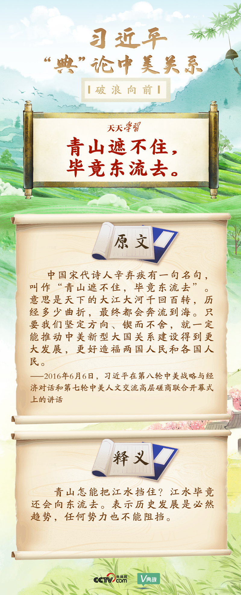 黨的十八大以來,習近平主席就中美關(guān)系發(fā)表了一系列重要講話。他站在時代高度分析、研判中美關(guān)系現(xiàn)狀及發(fā)展趨勢,并引經(jīng)據(jù)典為發(fā)展中美關(guān)系指出正確方向。這些論述蘊含深刻的戰(zhàn)略思維和政治智慧,具有重大現(xiàn)實意義和深遠歷史意義。央視網(wǎng)《天天學習》與您一起深刻領(lǐng)會。