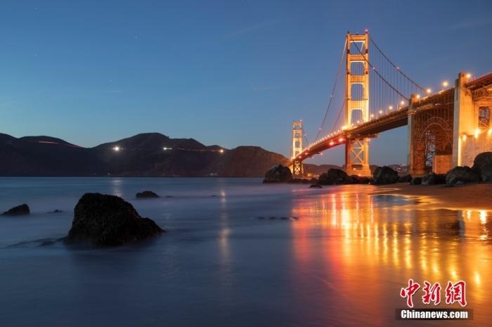 當?shù)貢r間10月29日,美國舊金山金門大橋在海浪和夜色的襯托下美如一幅畫。中新社記者 劉關關 攝