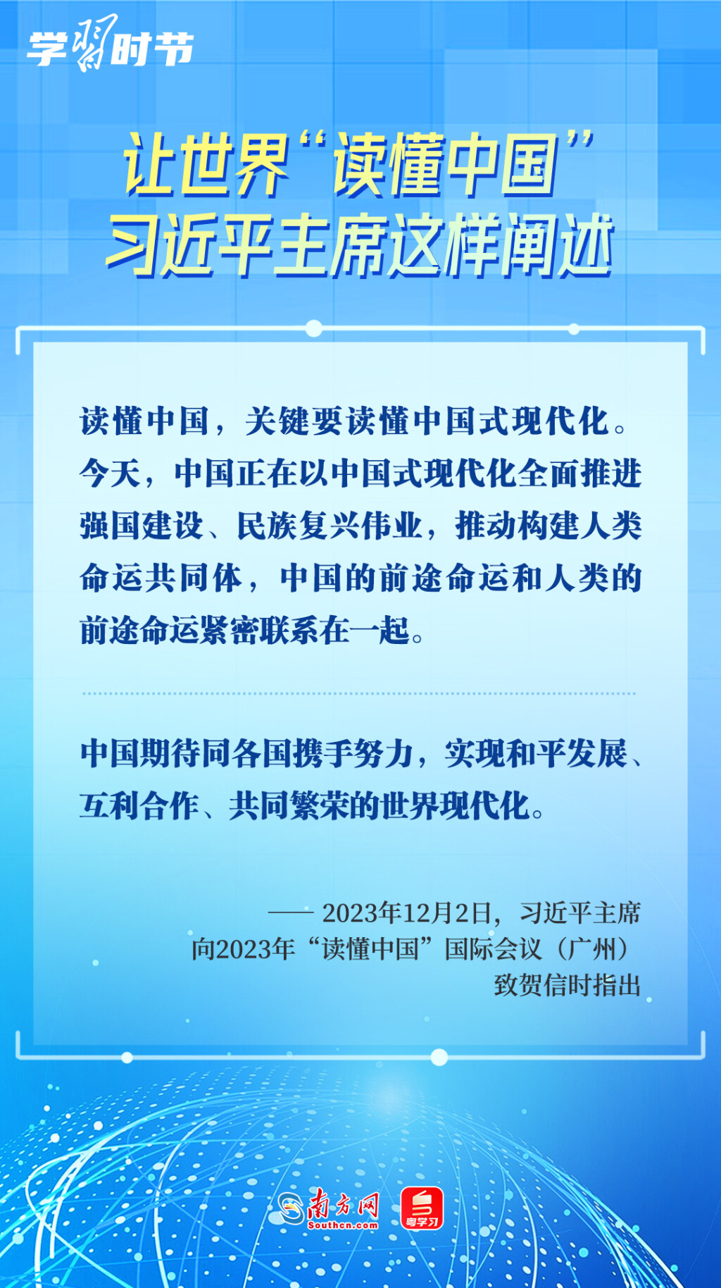 12月2日,2023年“讀懂中國”國際會議在廣州開幕,國家主席習近平向會議致賀信。習近平主席在賀信中指出,“讀懂中國,關鍵要讀懂中國式現(xiàn)代化?!?/span>