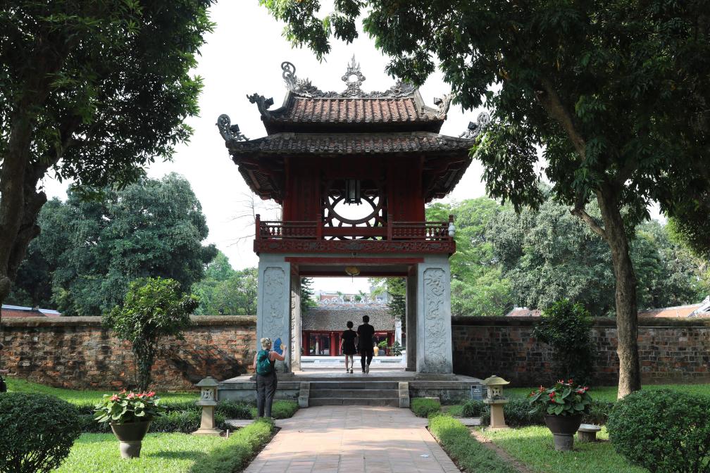 身穿古裝的中國(guó)游客和身穿越南傳統(tǒng)服飾奧黛的越南青年在文廟門前合影。