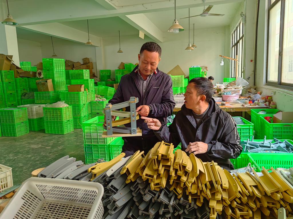 在自己創(chuàng)辦的工廠里,李金龍(左一)指導(dǎo)員工包裝玩具。(受訪者供圖)