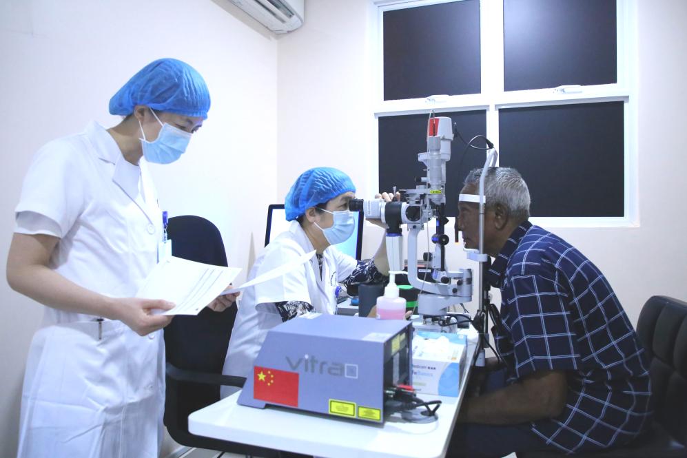 ??2023年2月4日,在馬爾代夫首都馬累附近的胡魯馬累醫(yī)院,中國-馬爾代夫眼科中心中方專家為當(dāng)?shù)鼗颊咦鲅劭茩z查。