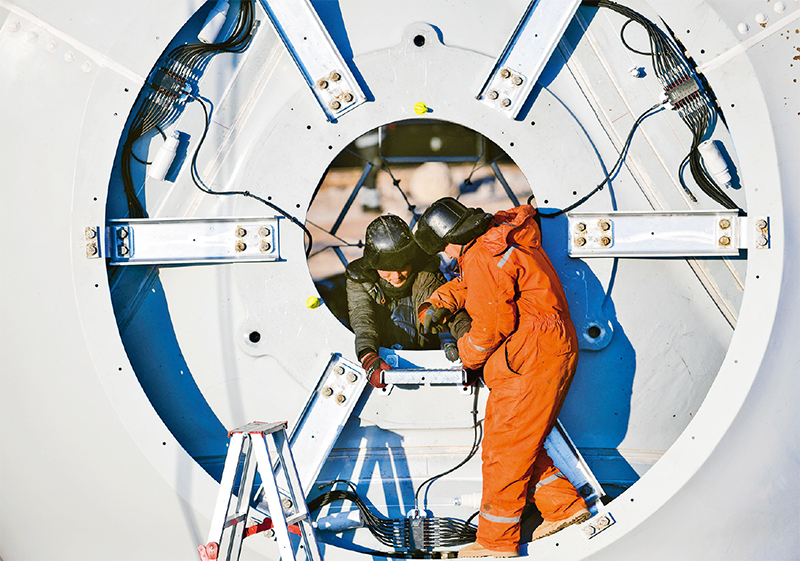 河北承德豐寧風(fēng)光氫儲(chǔ)100萬(wàn)千瓦風(fēng)光項(xiàng)目是國(guó)家“十四五”規(guī)劃的大型清潔能源基地——冀北清潔能源基地的標(biāo)志性工程。項(xiàng)目建成后,預(yù)計(jì)每年可生產(chǎn)綠電18億千瓦時(shí),減少二氧化碳排放約140萬(wàn)噸。圖為2024年1月12日,該項(xiàng)目的工人在安裝風(fēng)機(jī)輪轂配件。 新華社發(fā) 王立群/攝