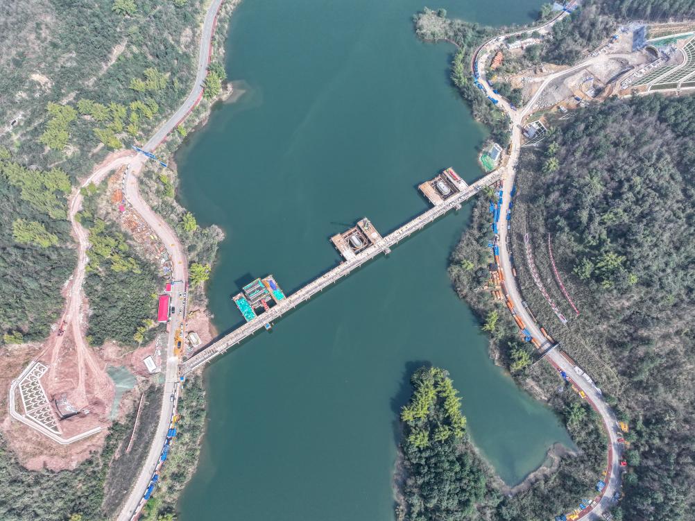 ??這是2月19日拍攝的位于重慶市銅梁區(qū)的成渝中線高鐵玄天湖大橋建設(shè)現(xiàn)場(chǎng)(無人機(jī)照片)。新華社記者 唐奕 攝