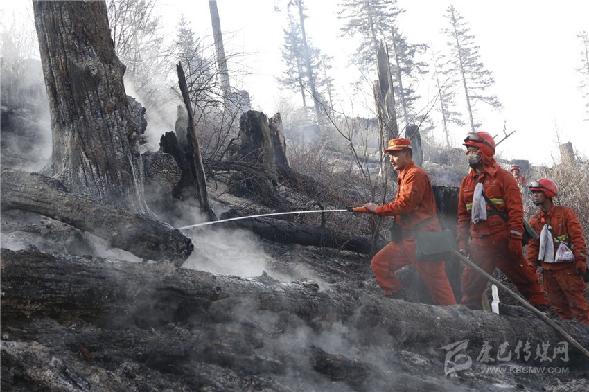 2月10日,火頭蔓延至火場(chǎng)東北一線,參戰(zhàn)官兵發(fā)現(xiàn)幾處被冰雪覆蓋的水源,火場(chǎng)前指決心改變戰(zhàn)法,采用7組水泵串聯(lián)接力向火場(chǎng)供水主攻明火,常規(guī)機(jī)具輔助配合消除煙點(diǎn)的方式,將部隊(duì)分為水泵和常規(guī)機(jī)具兩個(gè)梯隊(duì),在火場(chǎng)火勢(shì)最為猛烈的東北側(cè)展開(kāi)滅火作戰(zhàn)。參戰(zhàn)官兵用自身攜帶的鍬鎬奮力破冰面抽水,在水泵的助力下,明火得到了有效壓制并逐步熄滅。隨后,部隊(duì)和地方群眾全部轉(zhuǎn)入火場(chǎng)清理看守階段。