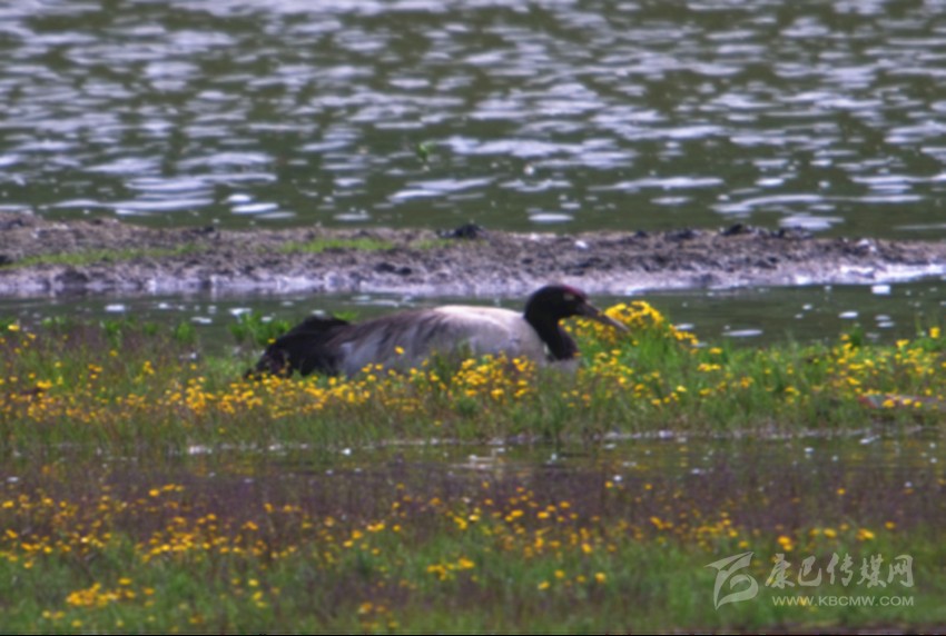 黑頸鶴是唯一生長繁殖在高原的鶴類,國家一級保護(hù)動物,冬季10月左右遷往云貴高原等低緯度地區(qū),2月下旬陸續(xù)返遷回到高原,到達(dá)白玉縣保護(hù)區(qū)時間一般在4月下旬。這次黑頸鶴繁殖巢穴位于麥拉降措湖邊一塊四面環(huán)水的平臺上,鮮花盛開,相對隱秘。
