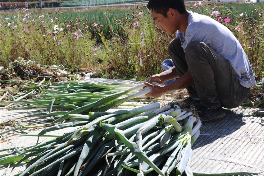 11月的高原,寒意漸濃?!霸鲿?,明天上午8點(diǎn)大蔥基地需要28個(gè)小工打捆大蔥上車…”5日,道孚縣溝爾普村支部書記四郎扎西接到大蔥基地管理人員葉洪亞的電話,四郎扎西說這是他今年接到安排村民到大蔥基地務(wù)工的無數(shù)個(gè)電話中的一個(gè)。