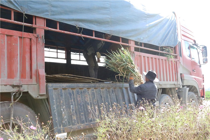筆者看到,充翁格美熟練地先用鏟子從田地的側(cè)面挖下去2寸深,將大蔥拔出來?yè)廴ジ毜哪嗤?,然后將斷根的、中等的、大的大蔥分別堆放,每15斤左右打捆,每10捆過稱后搬運(yùn)裝車。據(jù)他介紹,現(xiàn)在基地的大蔥每周要裝兩次車,每次裝10噸。