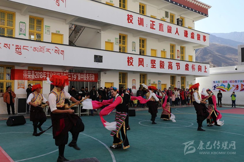 上午11點,歡快的音樂在小學(xué)操場上響起,演出正式開始。村民們圍坐在操場上,人頭攢動、彩幡飛舞、陽光正好。13個節(jié)目依次上演,包括男女群舞、女子群舞、男子合唱、女子合唱、男女獨唱,最有特色的是得榮本地特色群舞《雪域鍋莊》和《九步情》。