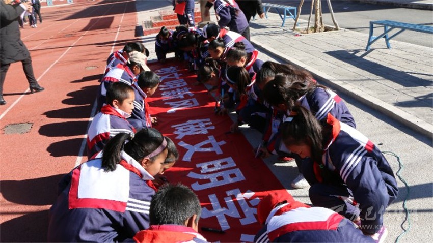 巴塘縣金弦子小學學生在文明禮儀橫幅上簽字。